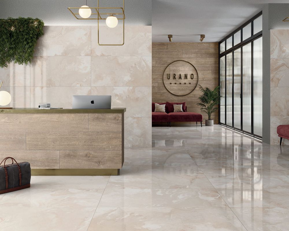 Керамогранит URANO от испанского бренда Alaplana — это коллекция с ярким эмоциональным рисунком, стилизованным под выразительный природный камень. Плитка увеличенного формата 60x120 см представлена в бежевых, голубых и серых оттенках с вариативными декорами, что позволяет создавать уникальные художественные композиции на стене или полу. Зеркальная полированная поверхность привносит роскошный блеск и живую игру света, усиливая декоративный эффект. Материал идеально подходит для создания акцентных зон в ванных комнатах, оформления зон отдыха, стоек ресепшн и баров в частных интерьерах и объектах коммерческой недвижимости, даря пространству неповторимый характер и эстетическое удовольствие.