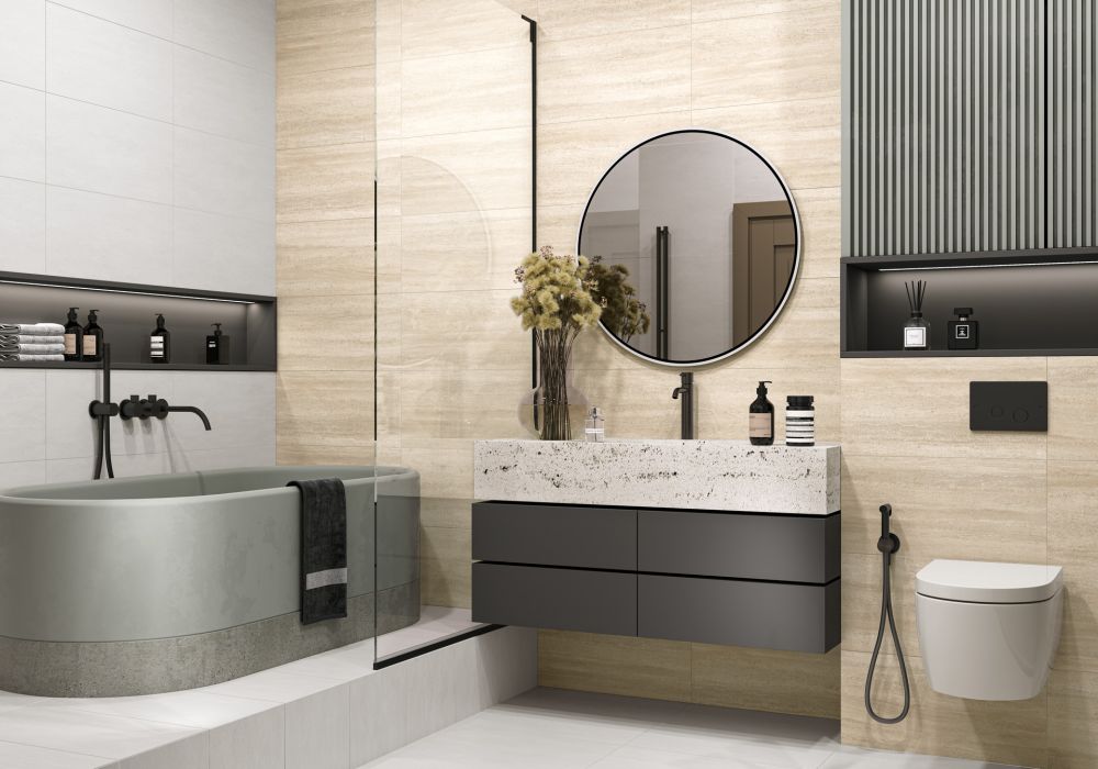 Коллекция Altesse от Alma Ceramica в формате 300×600 мм сочетает рельефную матовую поверхность с горизонтальной песочной текстурой. Тактильность натурального камня и мягкое светорассеяние создают уютную атмосферу, напоминающую природные слоистые породы и песчаные дюны.