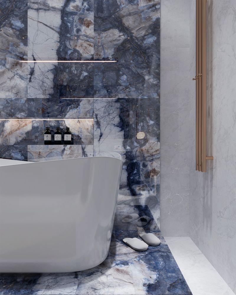 Керамогранит Arcadia Ceramica BERGAMO BLUE — это глубина сине-голубых оттенков и драматичная красота природного камня. Полированная поверхность с контрастными коричневыми прожилками создаёт эффект сияния и многогранности, наполняя пространство светом и динамикой. Этот материал станет ярким акцентом или элегантным фоном для любого интерьера — от минималистичной гостиной до экстравагантного дизайн-проекта, даря помещению уникальный характер и атмосферу уюта с художественным шиком.