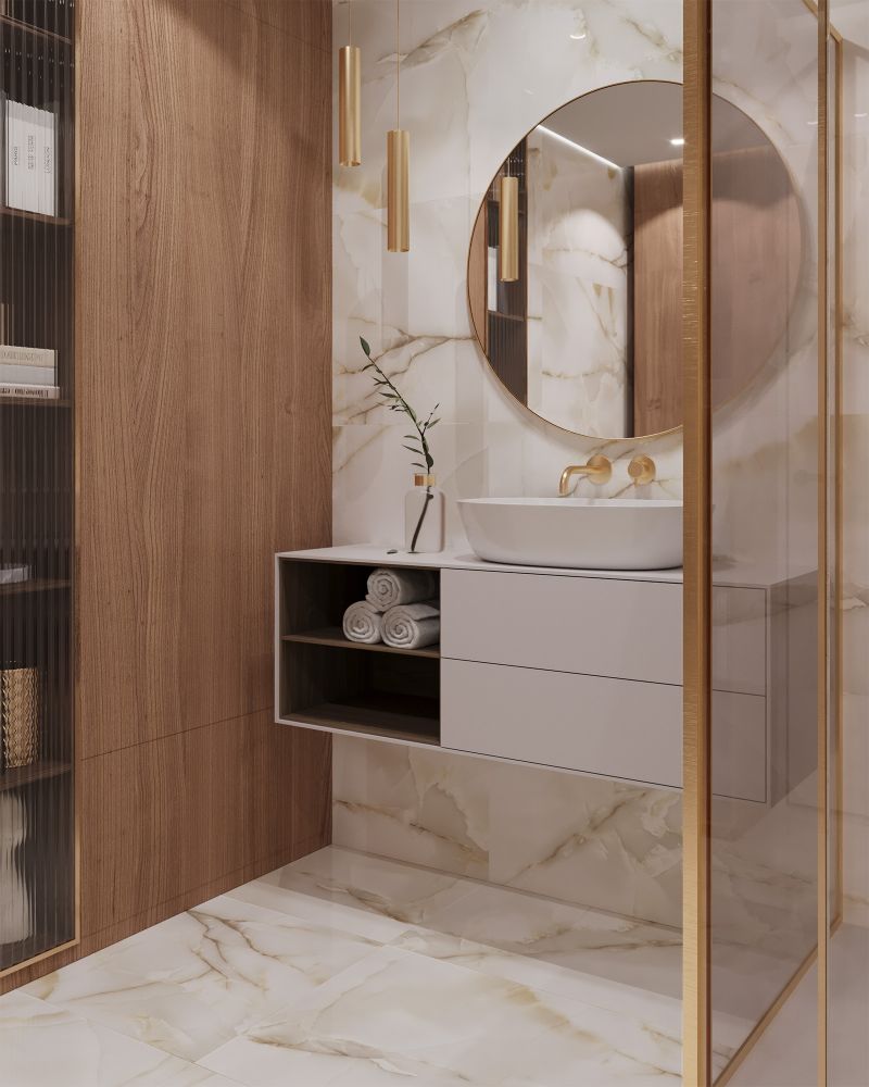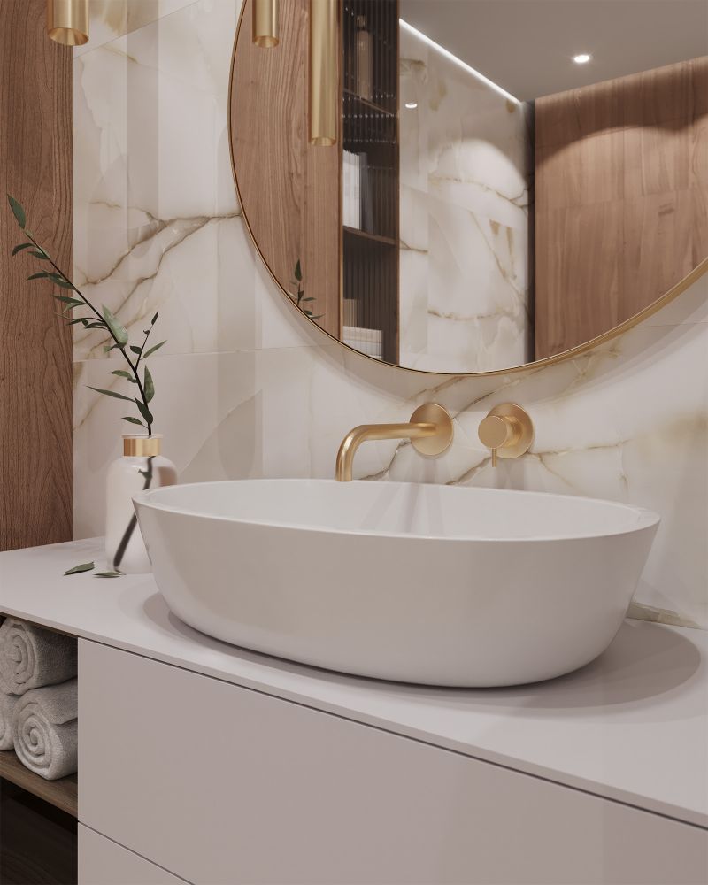 Керамогранит Arcadia Ceramica PRIMO ONYX BEIGE — это стильная имитация натурального оникса с тёплым оттенком и золотистыми трещинками. Глянцевая поверхность визуально расширяет пространство, наполняя его блеском и игрой отражённого света, что создаёт неповторимую атмосферу. Универсальный материал подходит для классических и современных интерьеров, идеально гармонируя с другими элементами декора и добавляя изысканность, природную красоту и уют в любое пространство.