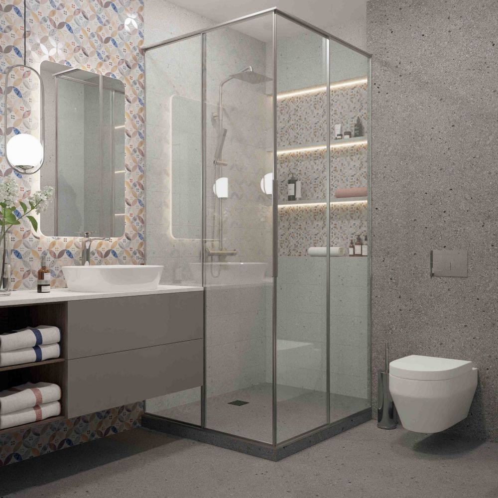 Коллекция керамической плитки Орегон от Axima предлагает изысканную альтернативу крупному формату, демонстрируя идеальный баланс цвета и эстетики. Настенная плитка в элегантном формате 20×30 см представлена с имитацией терраццо в серых, светло-серых и «пиксельных» вариантах. Декоративные вставки коллекции отличаются изящным и лаконичным дизайном. В качестве напольного покрытия предлагается керамическая плитка в формате 327×327 мм с рисунком терраццо в гармонирующей серой гамме, создавая целостный и стильный образ для современных интерьеров.