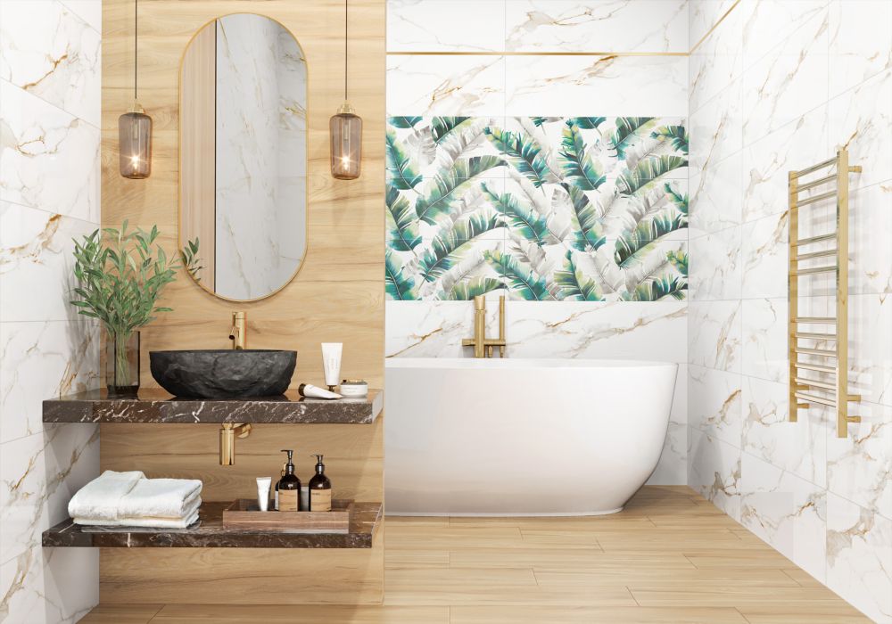Коллекция Barbados от Delacora в формате 300x900 мм сочетает глянцевый мрамор с золотой прожилкой, рельефную древесину и тропический декор с непрерывным рисунком. Ректифицированные края создают бесшовные плоскости, а золотой металлический стик дополняет ансамбль, позволяя проектировать интерьеры с индивидуальным характером и яркими акцентами.
