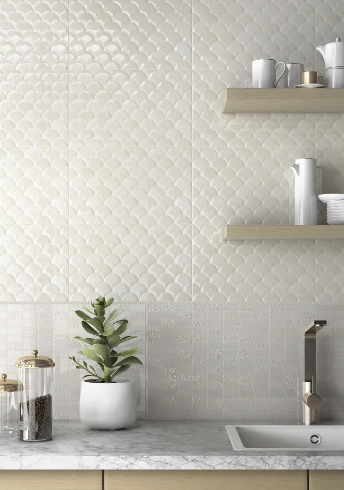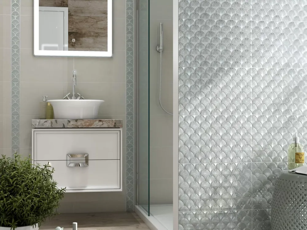 Коллекция керамической плитки Сияние от бренда Kerama Marazzi представляет три прохладных оттенка оникса в двух вариантах структуры — гладкой и рельефной под черепицу. Серию украшают объёмные декоры с россыпью перламутровых капель и нарезная мозаика. Важно учитывать, что номинальный размер необрезного керамического гранита соответствует нескольким калибрам, поэтому при заказе необходимо проверять единообразие калибра на упаковках, так как каждый калибр является отдельным рабочим размером в рамках нормативных допусков.