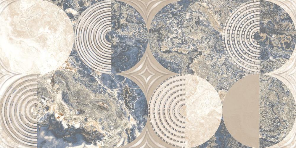 Стильная глянцевая вставка с геометрическим узором для создания смелых акцентов. Особенно эффектно смотрится в сочетании с синей фоновой плиткой, усиливая современный характер интерьера.