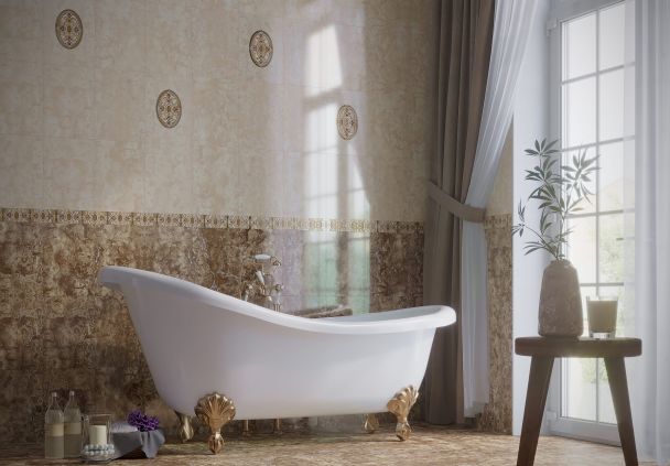 Матовая напольная плитка с мраморным узором в теплой бежево-коричневой гамме. Антискользящая поверхность сочетает практичность с элегантным дизайном. Создает атмосферу уюта и защищенности.