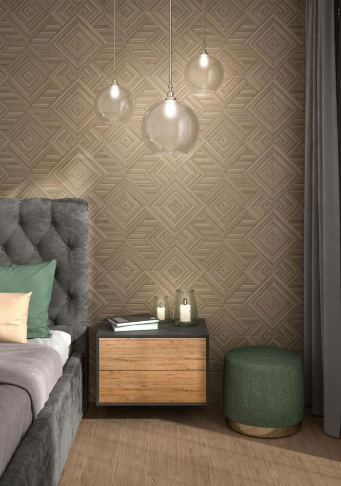 Современный вариант отделки — Настенная плитка "Ламбро" (Kerama Marazzi). Глубокие тона (бежевый) придают пространству характер. Формат 400 × 1200 востребован в проектах премиум-класса. Поверхность матовая.