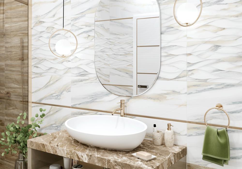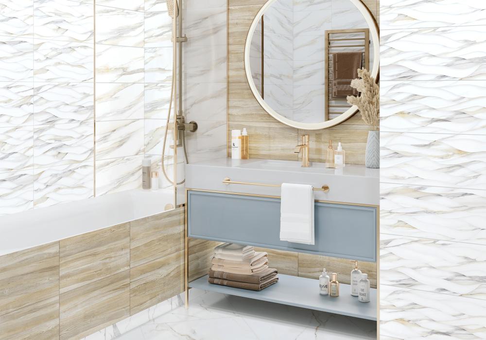 Современный вариант отделки — Плитка настенная "Corsica" (ALMA CERAMICA). Глубокие тона (белый, серый) придают пространству характер. Формат 249x500 востребован в проектах премиум-класса.