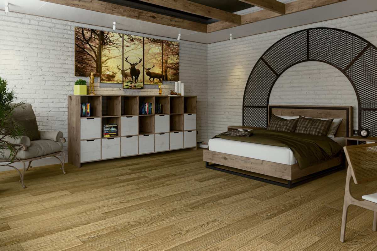 SPC ламинат Damy Floor Family Дуб Золотой 190902EL-07F — это высокопрочное кварц-виниловое покрытие 43 класса износостойкости, выполненное в теплых золотистых тонах с брашированной матовой поверхностью. Планки размером 1220×180 мм и толщиной 4,2 мм с четырехсторонней фаской точно имитируют текстуру натурального дуба, создавая эффект деревянного пола. Полиуретановый слой, усиленный углеродными нанотрубками, обеспечивает защиту от истирания и выцветания. Материал обладает 100% влагостойкостью, классом пожарной безопасности КМ2 и совместим с теплым полом до +27°C, что позволяет укладывать его в ванных комнатах, кухнях и коммерческих зонах. Гарантия производителя составляет 25 лет при использовании в жилых помещениях.